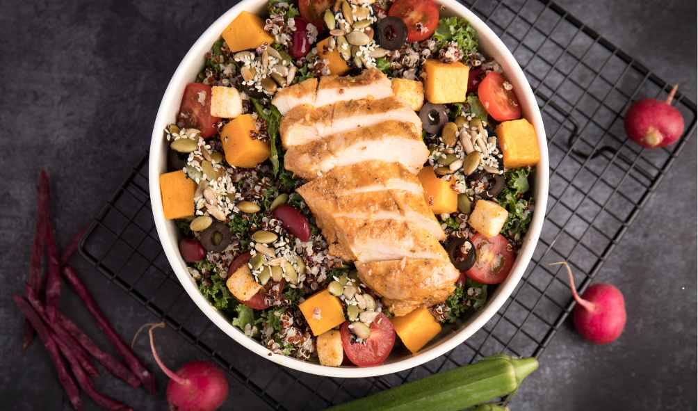 קינואה היא דגן-על מלא בחלבון, ומשתלבת נהדר בסלטים. צלו בתנור חצילים, בטטות, עגבניות ובצל עם מעט שמן זית ותבלינים. צננו את הירקות והוסיפו לקערה עם קינואה מבושלת, חומוס, טחינה ועשבי תיבול.